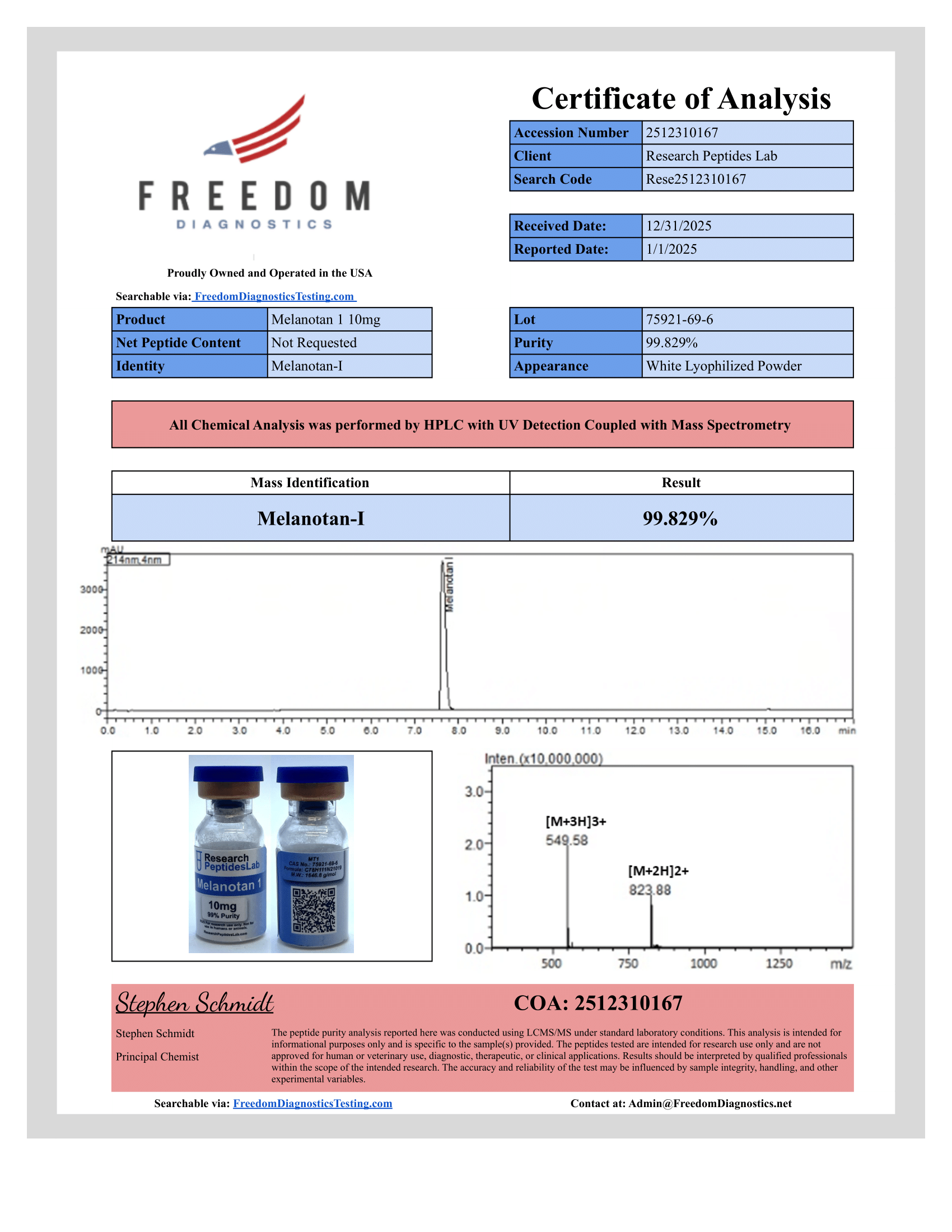 Each batch independently verified for purity (?99%) via HPLC and identity via Mass Spectrometry. Full COA available on this page.